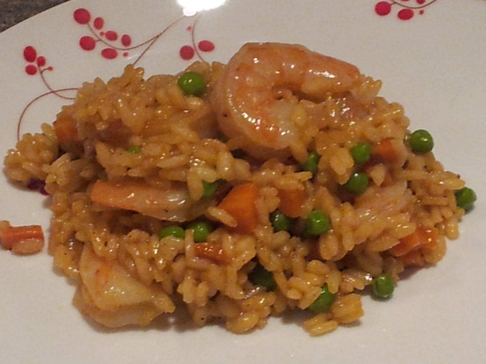 I am back to the Improv Cooking Challenge! I took a little break after Kellen was born because I participate in a few different challenges, and did not want to juggle too much while adjusting to our baby boy. It feels good to come back to the challenge because I really enjoy the Improv Challenge. If you are wondering how it works it is very simple- cook anything with the two assigned ingredients. This month the ingredients were peas and carrots ("Jenny and Me, we was like peas and carrots"...Ron's favorite movie). I debated between a few different ideas before I decided to create a risotto. I make a lot of risottos (in case you didn't notice), and decided that curry was the way to go. I added in a little shrimp and we had a delicious meal. Ron and I love curry and thought this recipe was spot on!